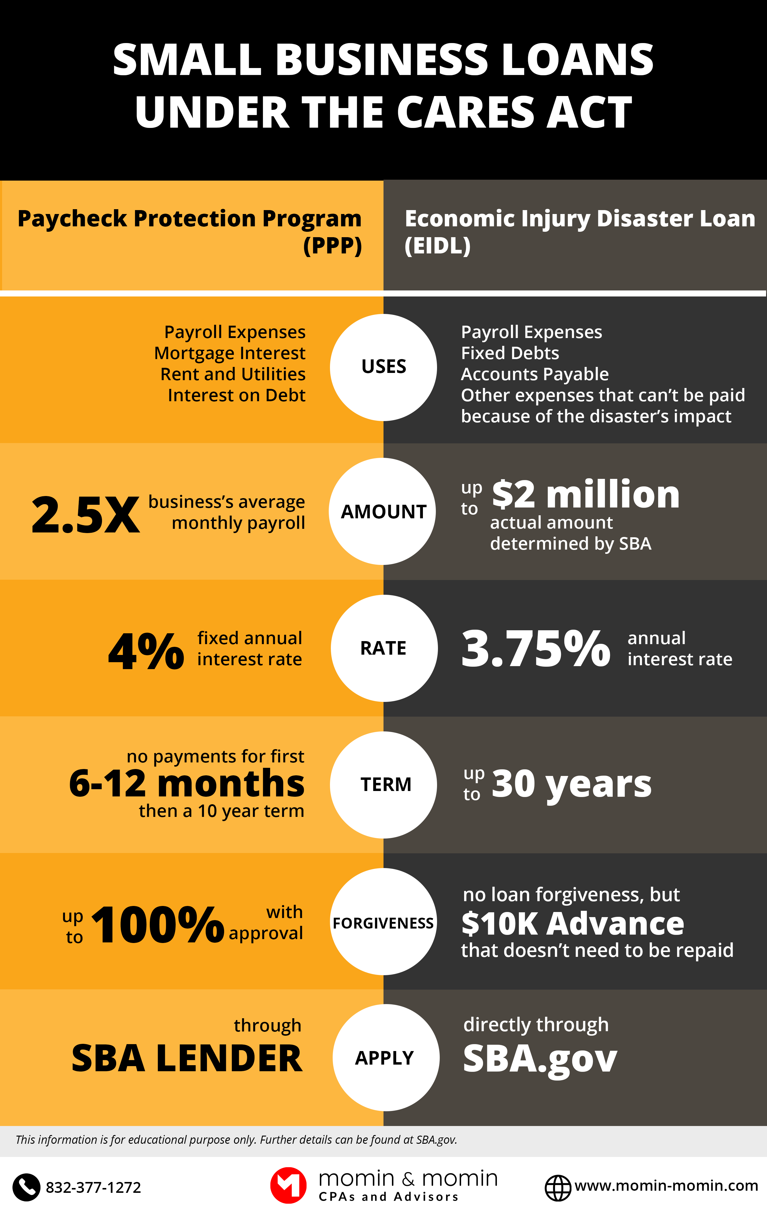 On March, 27th, President Trump signed the CARES Act into law that provides various assistance to individuals and small business owners. Below is the information on two loans available to small businesses (including self-employed).